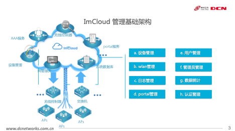 ImCloud是一种是具备易管理、易维护、大容量、高性能等特性,集认证、管理、无线控制等多位一体的云管理平台,可实现对全网无线设备管理、组织组织管理、用户账户管理、授权,数据采集、实时控制和执行各种网络策略,使整个教育网成为一个易部署、易维护、易扩展的网络。