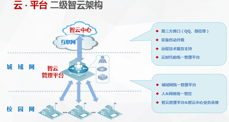 智云管理平台:部署在无线城域骨干网(一般指教育局机房)中,作为城域网统一管理平台,能够将人&网络统一管控,同时与智云中心业务承接相关云业务。