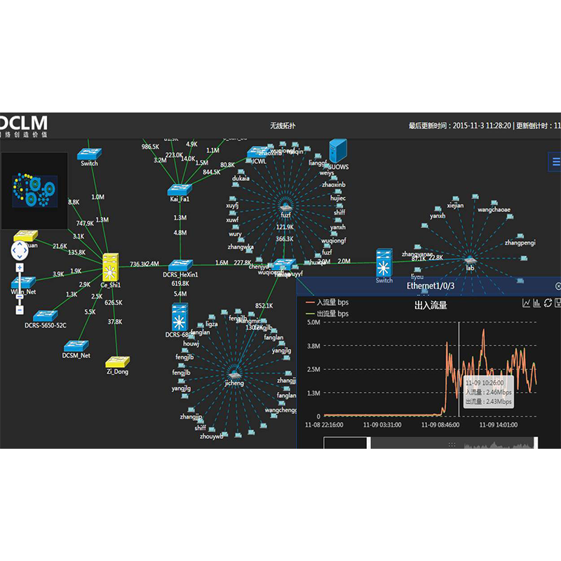 可以实时监控系统中所有设备的接口状态、出入流量、出入包数、丢弃包、错包等指标,可根据设定阈值产生告警,全部数据无损存储,可导出任意时间段的原始指标。
